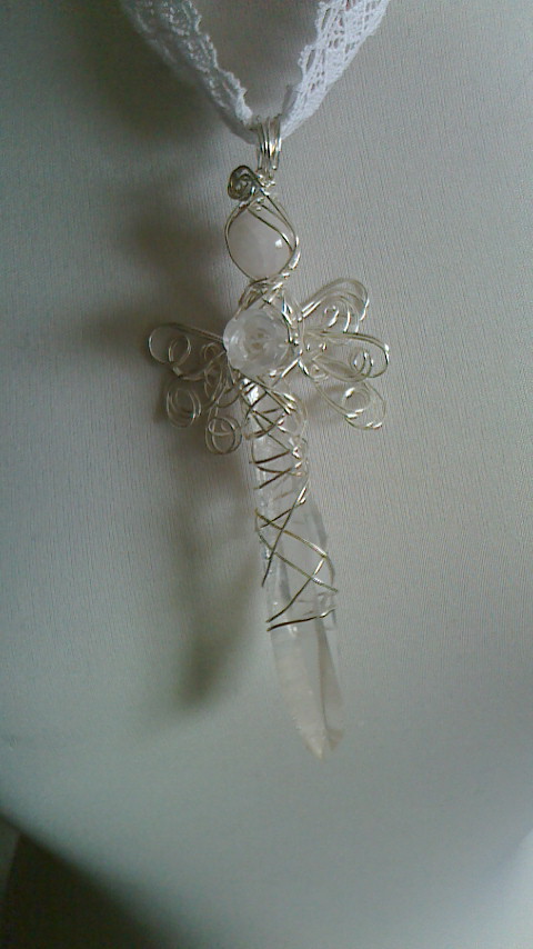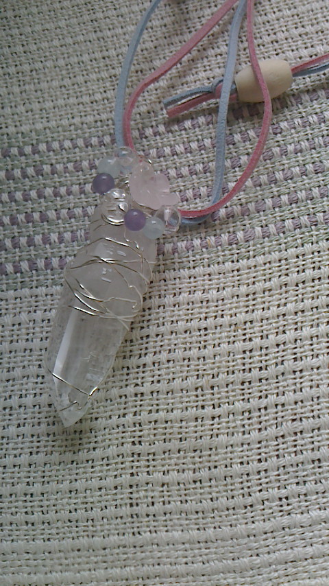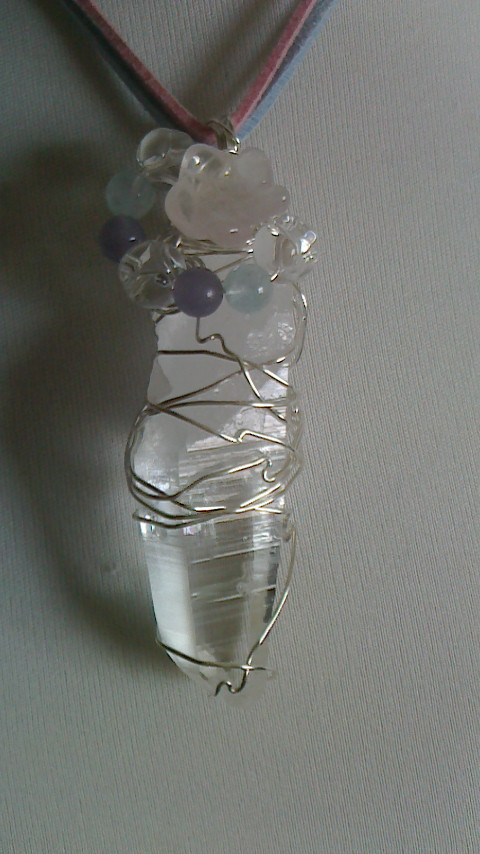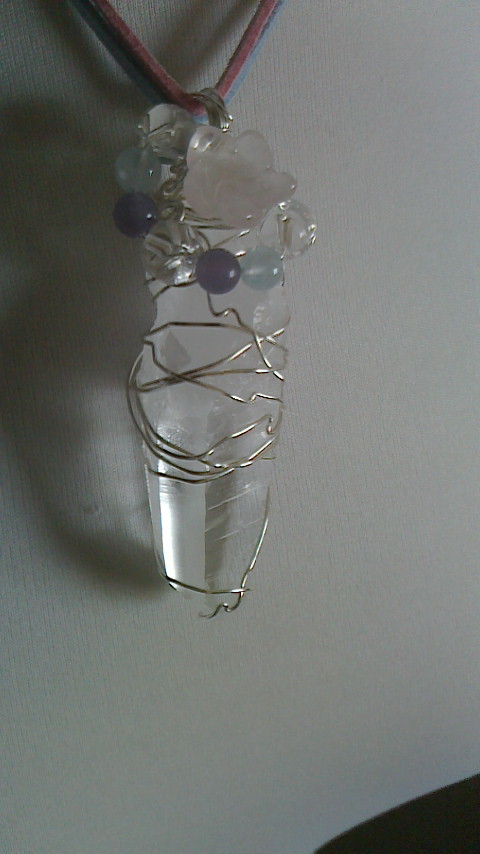 ローズクオーツの桜、ハートの組み合わさった水晶、レピドライト、アクアマリンで、巻き上げました。